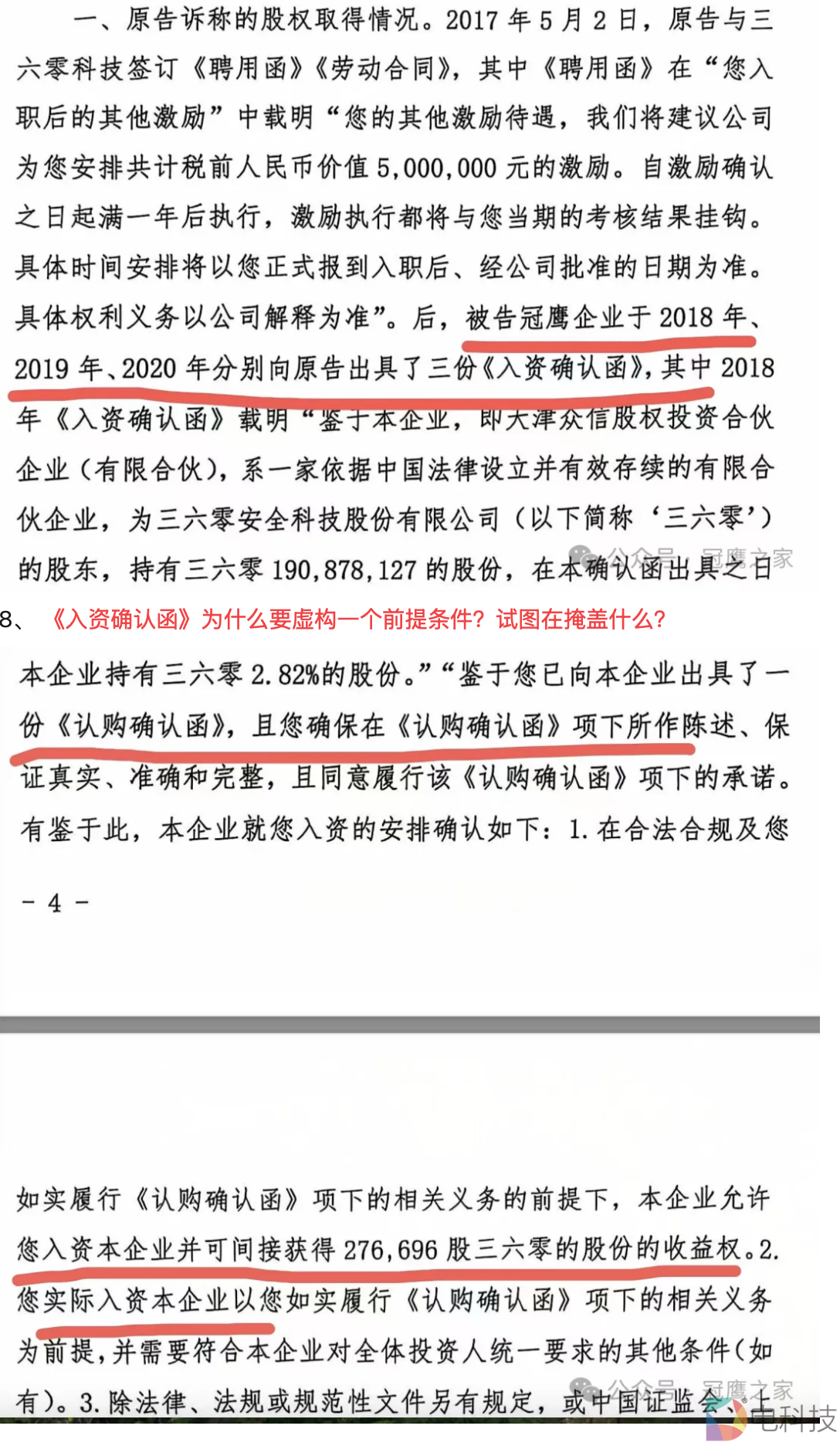 在法庭上,原告被告都承认,不存在《认购确认函》,没有这个安排,那么为什么《入资确认函》的正文中写上“鉴于您已向本企业出具了一份《认购确认函》------“,然后360当庭辩称因为原告没有发出《认购确认函》,所以《入资确认函》无效,真的是因果倒置。再说如果贵公司觉得《入资确认函》无效,为什么在第七问中连续3年给原告每年发一张《入资确认函》呢,明知无效还继续给原告发,骗对方干活三年?这涉嫌蓄意诈骗吧!见过骗感情、骗炮的,第一次看到上市大公司骗员工干三年活的!