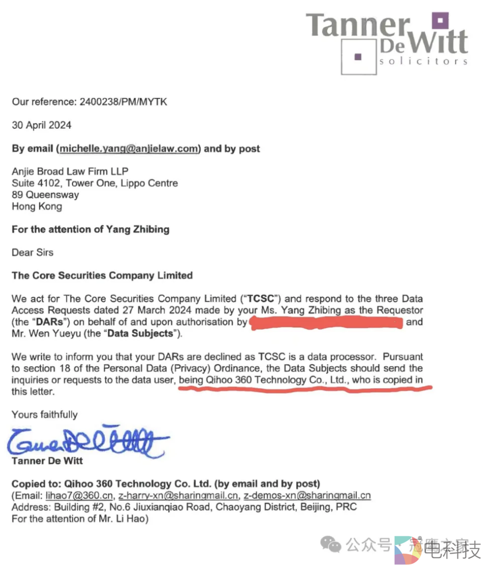 本来核聚都答应了支付200美元的查询费,就可以给我恢复账号,供我查询,结果在360的压力的下,在我将200美元查询费已经汇出到核聚提供的公司账户后,收到三天后又给原路退回来了,且回信给我们说:因为和360和合约导致不能给我们提供信息,并且邮件特意说明这封回信也CC给了360的员工,这个360邮箱地址经过我们查询确认是360法务部门的同事。360自己不提供前员工的期权流水记录,还阻拦第三方核聚公司提供记录信息,你们在害怕什么?