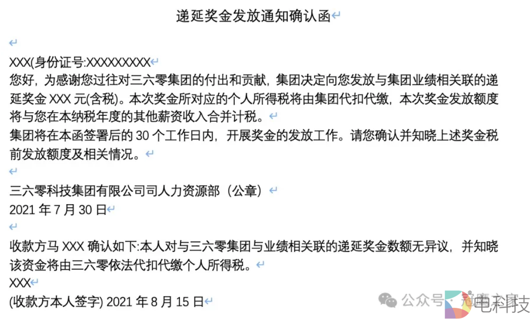 备注:因为此《递延奖金发放通知确认函》正文有当事人水印,为了保护隐私,故截图为正文摘录的版本,原本已经向法院提交。
