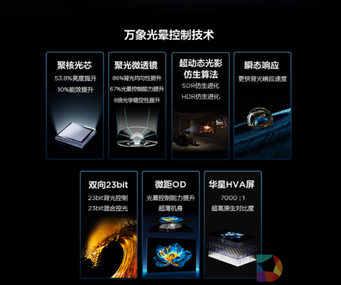 万象分区是基于TCL领先Mini LED控光技术的高效分区方案。该技术在12月中旬的TCL新技术发布会上首次亮相。TCL通过发光芯片、聚光透镜、OD值、控光算法和屏幕的全链路精准优化,形成了一整套完整的系统性光学解决方案,使得单个万象分区的控光效果比普通分区高出数倍,实现“一区顶多区”的突破,是目前最先进且完善的Mini LED控光方案。