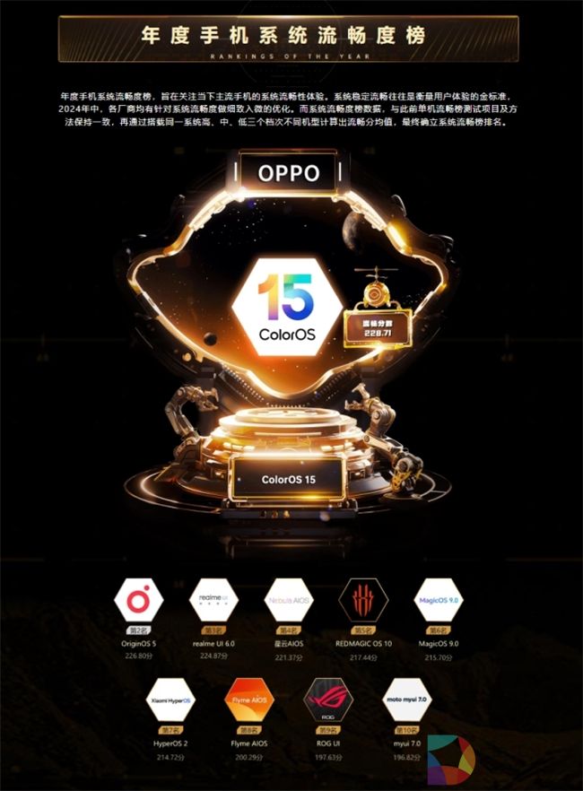 最终,由搭载该系统参测机型的稳定流畅平均分(占比70%)+鲁大师APP体验评测平均分(占比30%)计算出系统流畅总分,ColorOS 15以228.71流畅总分成功坐稳2024年度“最流畅手机系统”。