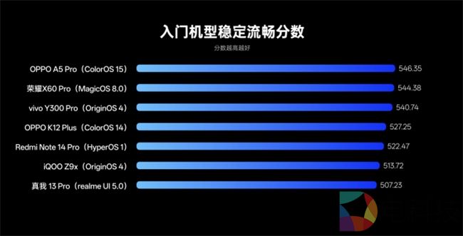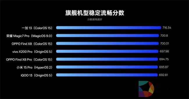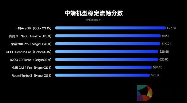 可以看到,搭载ColorOS 15的一加 13和OPPO Find X8分别以716.34和700.01的稳定流畅分,在旗舰阵营中拿下第一、三名的好成绩。而中端、入门机型阵营,同为ColorOS 15的一加 Ace 3V、OPPO A5 Pro也各自登顶同阵营稳定流畅第一名。