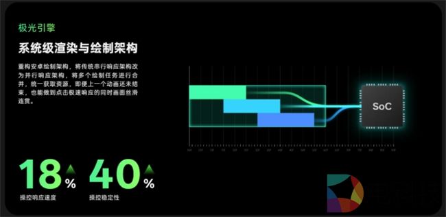 “极光引擎”是OPPO自主研发的系统级渲染和绘图框架,专注于应用层面,即用户直接能感知到的部分。它通过采用并行绘制技术,实现了行业内首个可中断的并行动画效果,有效解决了用户在使用过程中遇到的动画卡顿和资源分配不均的问题。得益于“极光引擎”的优化,ColorOS 15系统的操控响应速度和稳定性分别提高了18%和40%。