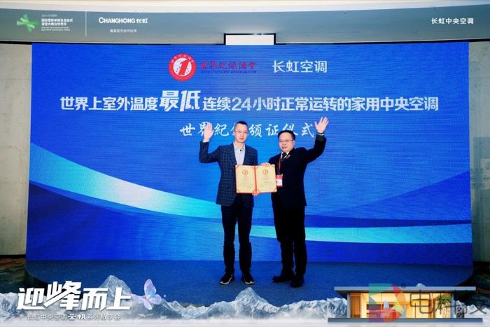 私享会现场,长虹中央空调云帆系列凭借强制热能力和稳定性卓越表现,创“世界上室外温度最低连续24小时正常运转的家用中央空调”世界纪录,世界纪录协会现场为长虹中央空调颁发了认证证书。