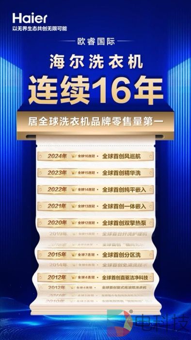 刚刚过去的2024年,海尔洗衣机在全球洗护行业再次拔得头筹,继续夯实着行业第一的市场地位。1月8日,世界权威调研机构欧睿国际发布的最新数据显示:2024年,海尔洗衣机品牌零售量全球第一,这也是海尔洗衣机第16次蝉联全球第一。