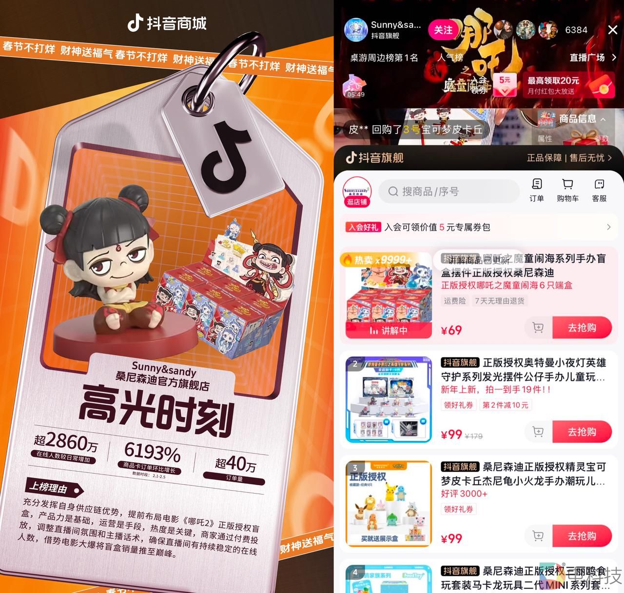 将产品与春节热门话题深度捆绑,能够达到1+1>2的营销效果,不少抖音电商商家深谙此道。电影《哪吒2》的火爆直接带动了衍生品销量,抖音商家或提前布局、或火速跟进,接住这波“泼天富贵”。Sunny&sandy桑尼森迪官方旗舰店充分发挥自身供应链优势,提前布局电影《哪吒2》正版授权盲盒,借势电影大爆将盲盒销量推至巅峰。春节期间三位主播不停播,轮番上阵cos电影角色,将粉丝热情持续拉满。最终店铺通过活跃直播氛围、付费投放、产品力等综合竞争力的加持,吸引了源源不断的购买力,2月1日-5日成交超2860万元,环比增长6193%。与经典IP深度融合的小小盲盒成为店铺活招牌。