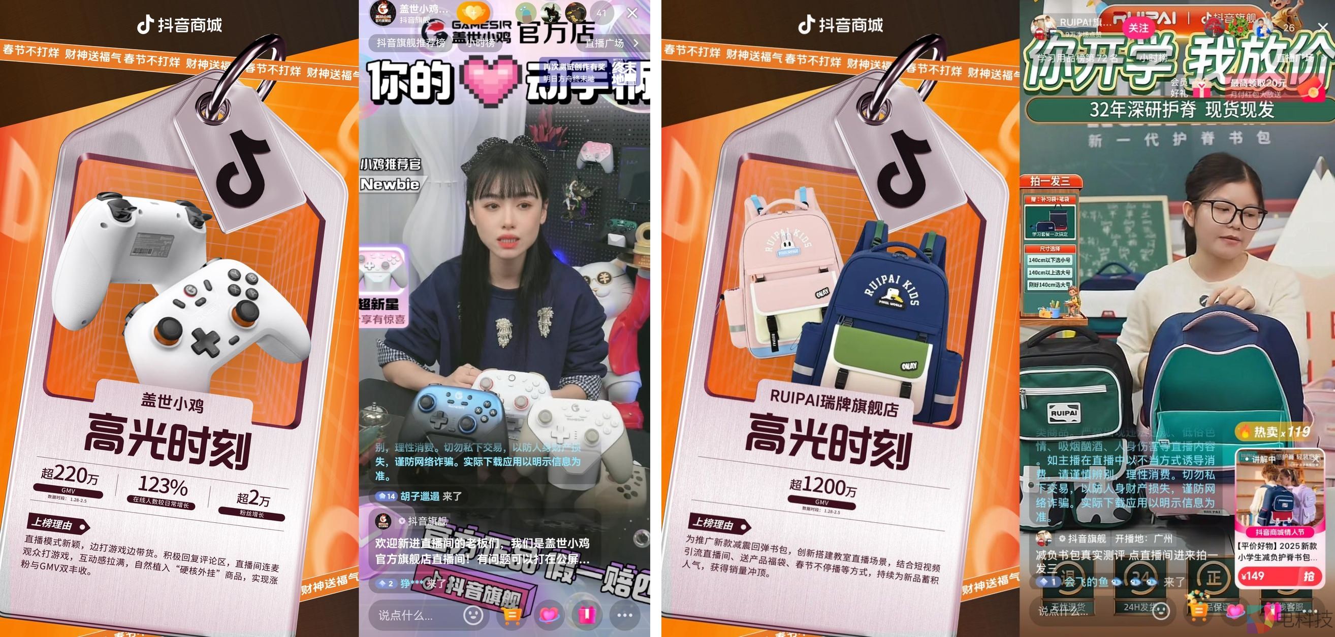 个性化的沉浸式直播场景也能够助力商家流量爆发。春节是一个难得放松身心的长假,盖世小鸡店铺直播间创造性地边打游戏边带货,带网友一起嗨玩整个春节,互动感拉满。春节期间,店铺涨粉超2万,1月28日至2月5日热卖超220万元,同比增长81%。RUIPAI瑞牌旗舰店为推广新款减震回弹书包,搭建教室直播场景,并结合短视频引流直播间、送产品福袋、春节不停播等方式,持续为新品蓄积人气,获得销量冲顶。春节期间,该店铺热卖超1200万元,成为全新人气王。