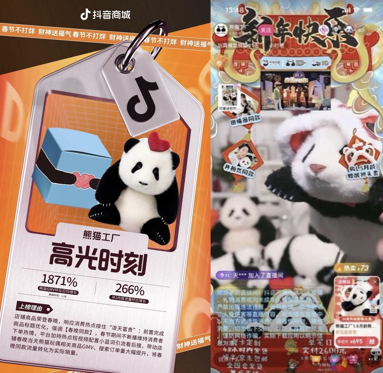 春晚是每年春节必备的“团圆大餐”,而“春晚同款”则是商家的流量密码。传承齐鲁百年非遗工艺“裘皮手工技艺”的文创品牌熊猫工厂,通过“巧”卖春晚同款玩偶喜提好业绩。春晚倒计时节目中,熊猫花花玩偶作为送给嘉宾丁禹兮的礼物露出。商家通过优化商品SEO“春晚同款”、上线热点#想要拥有丁禹兮的同款熊猫、对热点短视频配置小蓝词引流看后搜等整套操作,将春晚同款流量转化为实打实的销量。春晚当天带动店铺熊猫玩偶相关商品GMV环比近1周日均增长1871%,其中搜索流量对订单的贡献功不可没,搜索订单量环比增长1400%,搜索GMV环比增长678%。