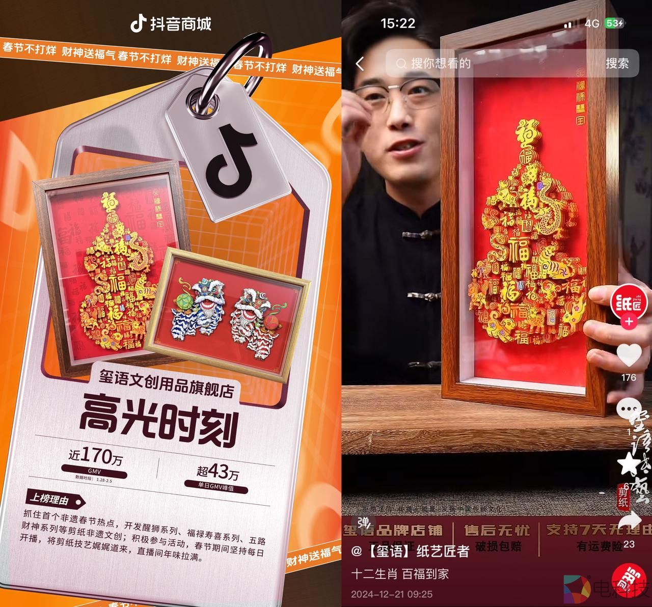 中国人把追寻“年味”刻进DNA,体验非遗文化成为最具年味的存在。2025年春节是首个“非遗版”中国春节,主打国潮文创、非遗文创的店铺获得广大消费者追捧。曾获得省级文创大赛金奖的非遗头部商家玺语文创用品旗舰店,坚持春节每天开播,生动有趣地介绍非遗剪纸技艺,堪称“年味担当”。其针对春节开发的醒狮系列、福禄寿喜系列、五路财神系列等多款高端剪纸艺术非遗文创深受用户喜爱,销量一路猛增。1月28日-2月5日春节大促期间店铺营业额近170万元,单日峰值超43万元。