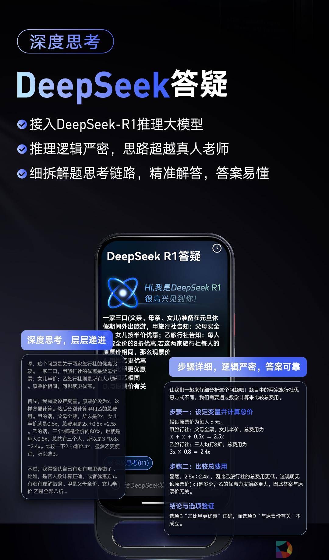 在学习场景中,答疑辅导是中小学学生最高频、也是难度最大的刚需场景。不同于以往大多数解题工具只能给到标准化答案,融合了DeepSeek-R1推理模型能力的有道SpaceOne在题目讲解答疑方面甚至比真人老师更出色,主要体现在三个方面:首先,有道SpaceOne更注重讲思路而非直接给结果。它通过可视化拆解思考过程,让学生清晰看到思路逻辑,就像老师把从0开始最详尽的“草稿纸”还原给学生看,不遗漏任何一个容易忽略或默认跳过的环节。
