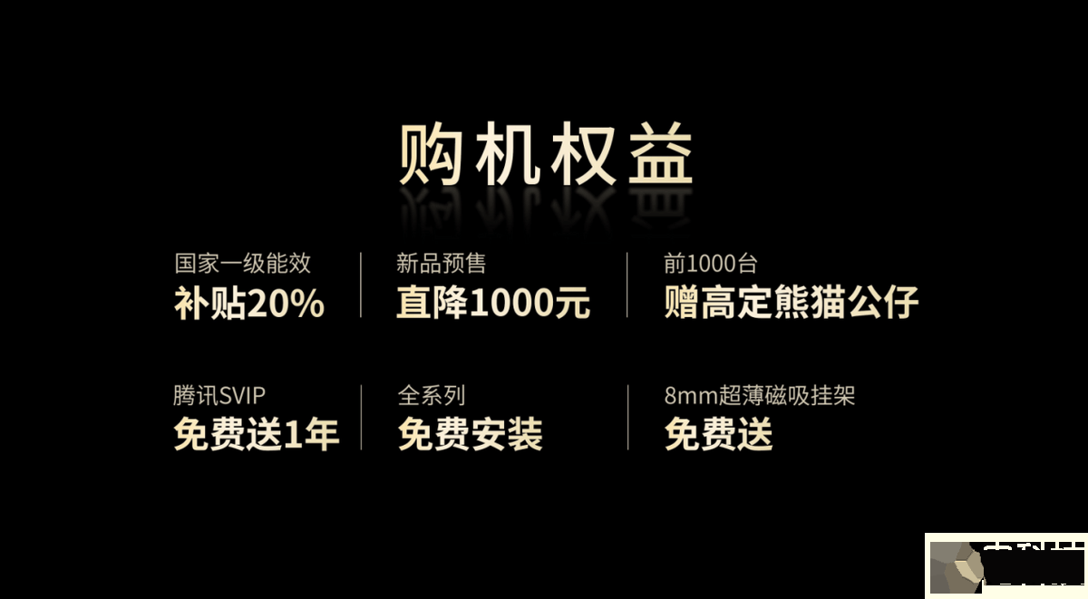 长虹Q10Air共推出65英寸、75英寸、85英寸三个版本,零售价分别为8997元、11997元、14997元,且均可享受国补福利,让质价比进一步提升。此外,长虹还准备了丰富的购机权益:新品预售直降1000元、前1000台赠送高定熊猫公仔、免费送1年腾讯SVIP和少儿会员、全系列尺寸免费安装以及8mm超薄磁吸挂架免费送!