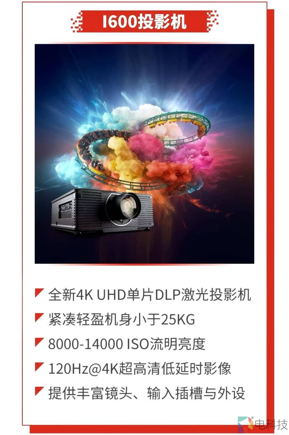 I600是全新4K UHD单片DLP激光投影机,具有更轻盈的体积、更明亮的图像质量、更优秀的可视化技术,具有8000-14000 ISO流明亮度,120Hz@4K超高清低延时,紧凑轻便,不到25kg,易于安装和运输,提供丰富镜头、输入插槽与外设,适配广泛行业。