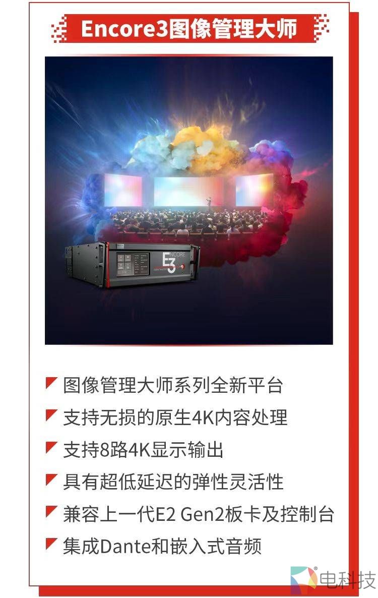 Encore3是图像管理大师系列全新平台,更为先进可靠,输出带宽比上一代产品E2提升一倍,支持8路4K显示输出,信号延迟更低,功能更强大且稳定。同时,Encore3兼容上一代E2 Gen2板卡及控制台,集成Dante和嵌入式音频,客户在升级换代时可节省投资成本