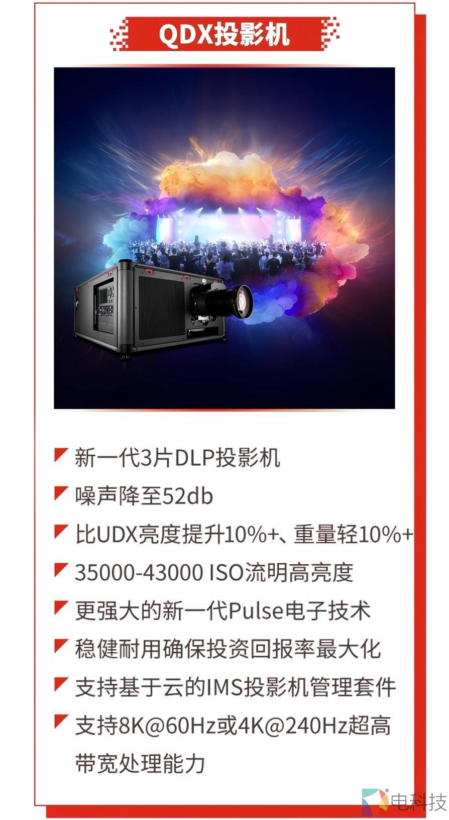QDX系列是新一代三片DLP激光投影机,亮度提升10%,重量轻10%,亮度高达35000-43000 ISO流明,同时噪声噪声降至52db,支持8K@60Hz或4K@240Hz超高带宽处理能力,更强大的新一代Pulse电子技术,满足客户对图像质量和色彩还原的更高需求。