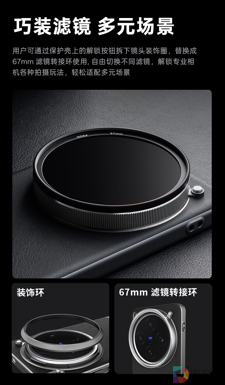 滤镜扩展 :用户可通过手机壳上的解锁按钮拆下镜头装饰圈,替换成67mm滤镜转接环使用, 自由切换不同滤镜,解锁专业相机各种拍摄玩法,轻松适配多元场景。