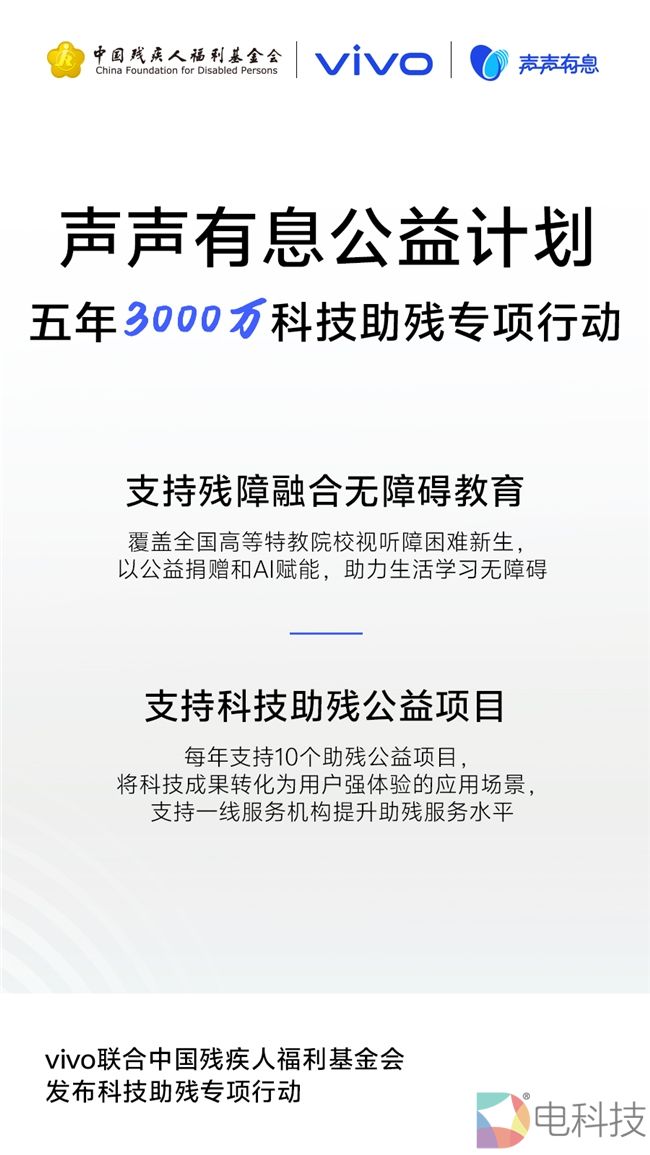 第三十五个全国助残日到来之际,vivo携手中国残疾人福利基金会正式开启“科技助残公益项目征集”,旨在通过资金支持与技术赋能,推动科技成果转化为残障群体可感知的无障碍应用场景,助力残疾人服务机构提升科技助残能力,促进残障群体更好地融入数字社会。