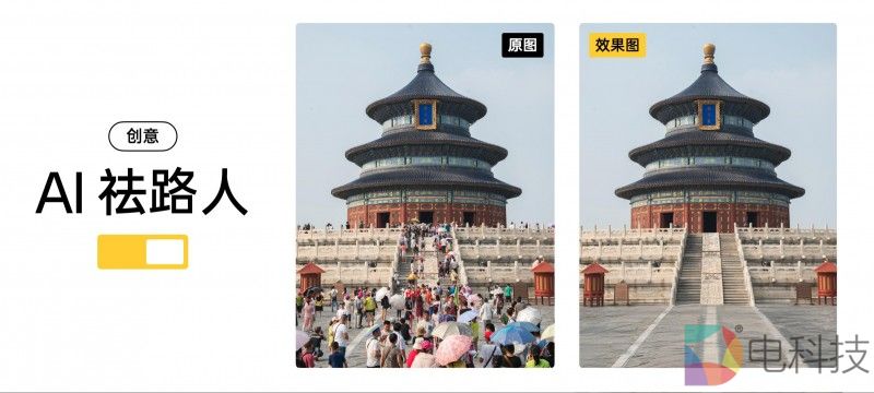 举例来说,基于方糖大模型的AI祛路人功能,即便是遇到元素繁杂的城市街道,或者纹路精细的自然山川,在精准祛除路人的同时,可以根据背景的环境、光影和色彩关系,生成与原图风格高度契合的画面信息。即便背景的路人处于虚化效果,生成的元素也能完美模拟同参数的虚化效果,让画面毫无违和感。