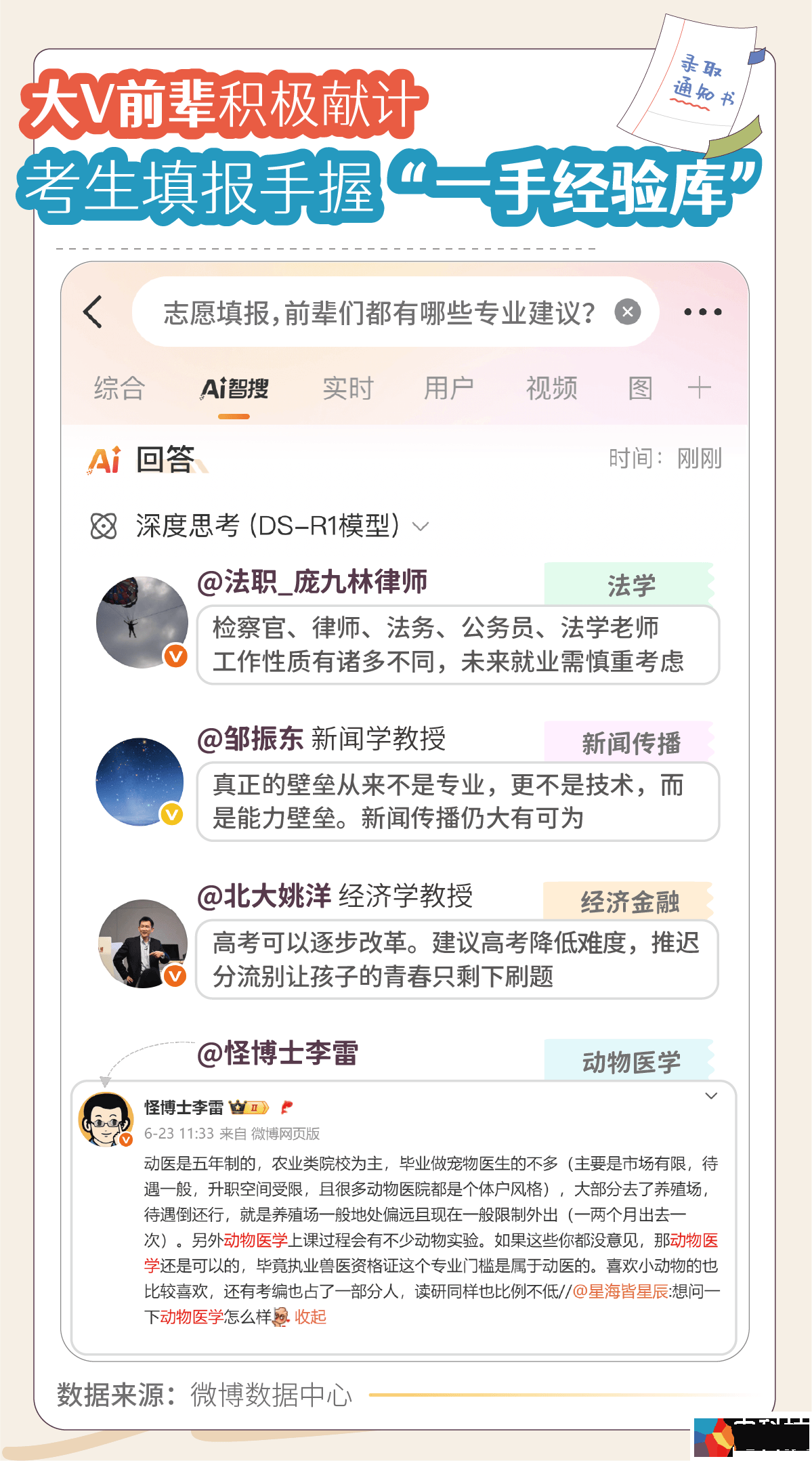 除了业界大咖,各领域专家学者、大V也积极发声,为考生构建专业“智囊”。@法职_庞九林律师 指出法律多种岗位的工作性质有诸多不同,未来就业需慎重考虑;厦门大学新闻学教授@邹振东 为新闻传播专业正名,强调真正的壁垒从来不是专业,而是能力壁垒;经济学教授 @北大姚洋 建议高考可以逐步改革。如降低降低难度,推迟分流;新知博主 @怪博士李雷 为家长提供动物医学的实务见解。通过智搜AI整合,分散的专业智慧被系统化呈现,形成考生填报志愿的权威参考,让决策更加科学理性。