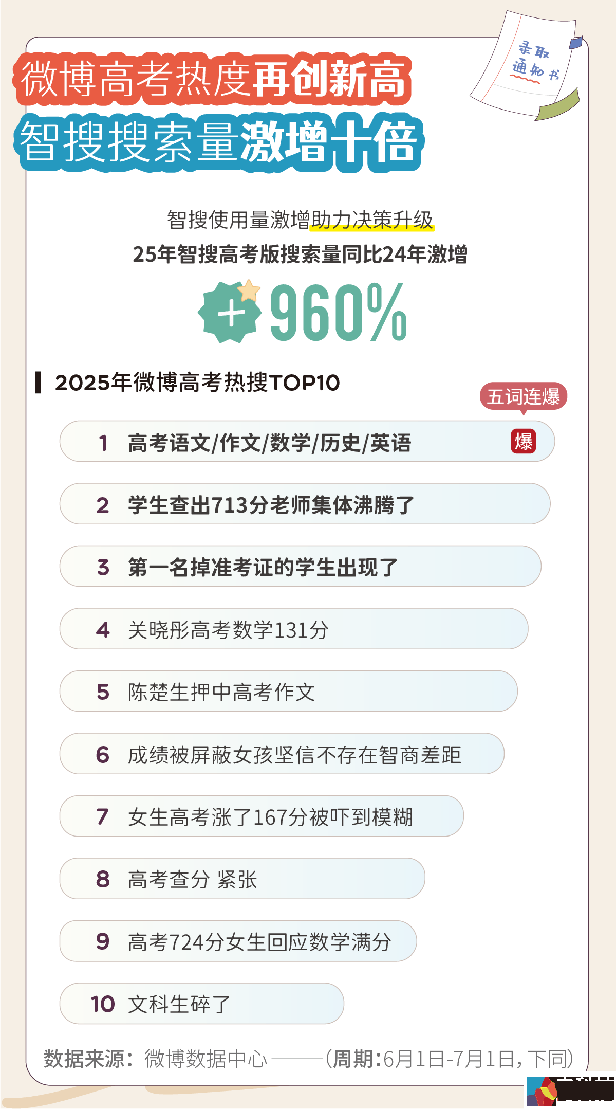 报告数据显示,2025年,智搜高考版搜索量同比2024年激增960%,全民志愿信息获取需求迫切。借助微博智搜,考生家庭正在更新高考信息获取方式,从传统被动接收转向主动精准查询。