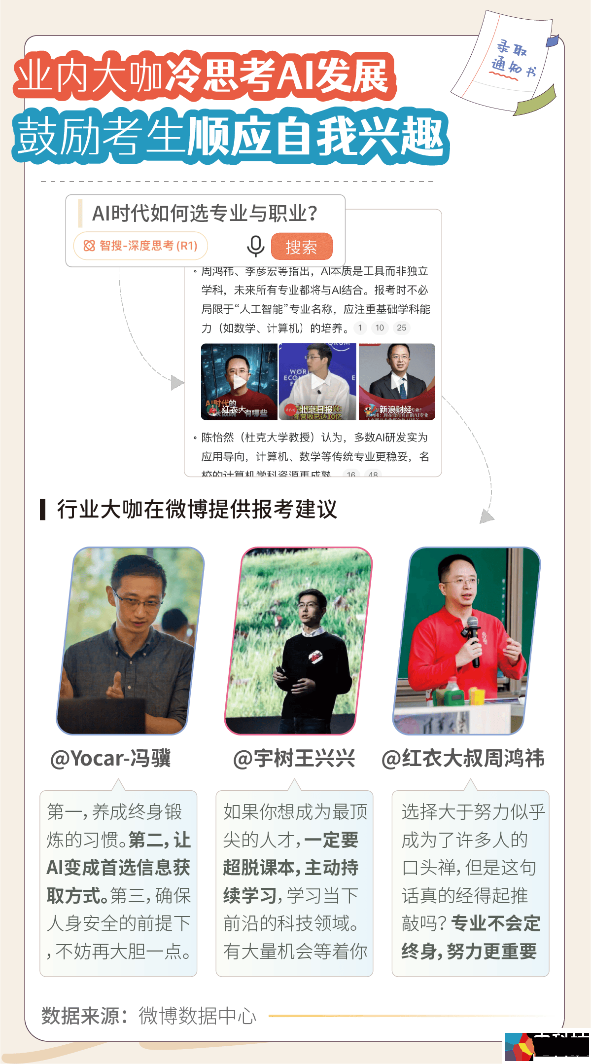 面对AI浪潮席卷的时代背景,企业界领袖在微博平台分享专业选择的深度思考,为迷茫的后辈提供经验和认知层面的宝贵助力。宇树科技创始人 @宇树王兴兴 发文聊志愿填报心得,提出“如果你想成为最顶尖的人才,一定要超脱课本,主动持续练习”,该博文分享得到人民日报官方公众号转发并引发热议、迅速破圈;黑神话·悟空开发者 @Yocar-冯骥 建议养成终身锻炼的习惯,让AI变成自选信息获取方式,并学着让自己勇敢一点; @红衣大叔周鸿祎 强调“专业不会决定终身,努力更重要”,他们相信,AI发展并非各行业的末路,审时度势,用热爱发力仍大有可为。
