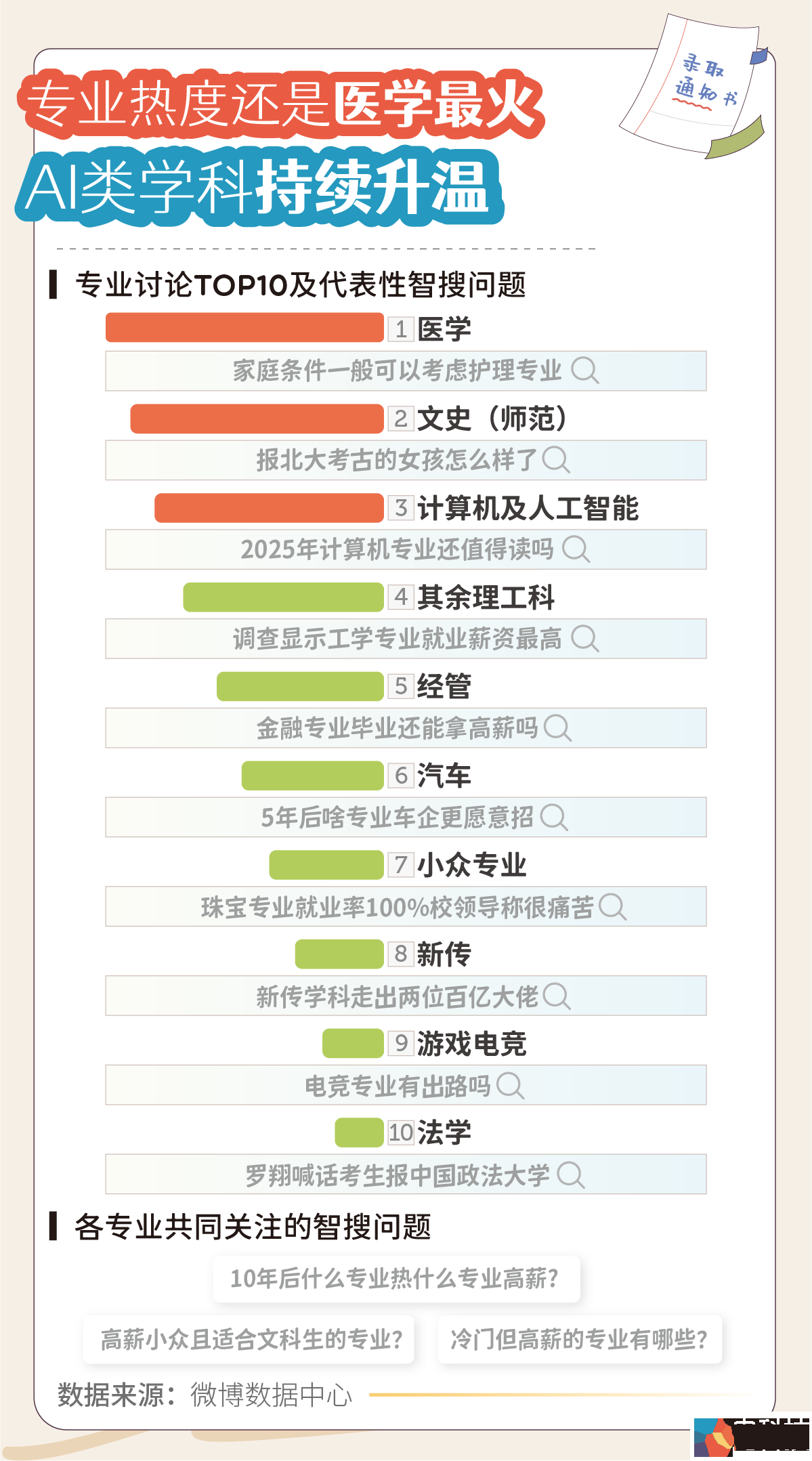 报告显示,2025年高考季微博平台热度再创新高,智搜高考版搜索量同比去年激增960%,是考生获取决策信息的关键渠道。在微博联合@人民日报 发起的#专业报考指南# 讨论活动中,医学、文史、AI专业讨论量三足鼎立,考生专业选择务实化;复旦、深大分领双一流与非双一流院校关注榜首,东部沿海地区依然是考生心中热选;“本升专”现象引发广泛讨论,学历价值认知悄然转变;空调成大学刚需,硬件设施影响择校权重显著提升。微博联合各方力量,通过智搜高考版整合官方数据、专家解读、校友经验,构建起覆盖全国高校的“一手经验库”,累计助力5.3万+条智搜补充问答建议生成,为1335万考生科学填报保驾护航。