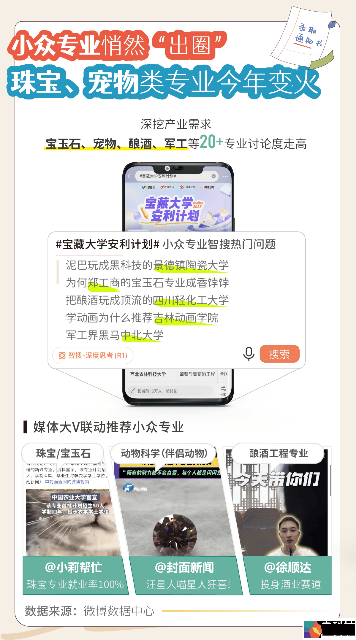 深挖产业需求,挖掘小众好专业。今年高考,微博还发起#宝藏大学安利计划#,挖掘高频热问、通过校园大使覆盖120所高校推广,累计带动超5.3万条智搜补充回答,让宝玉石、宠物、酿酒、军工等20+专业讨论度走高。热门智搜问题中,景德镇陶瓷大学、郑工商的宝玉石专业、四川轻化工大学的酿酒专业、吉林动画学院的动画专业,以及军工界黑马中北大学等问题搜索量相继升温,搭配权威媒体与大V联动解读,让小众专业走进大众视野。助力考生深入挖掘特色院校、寻路差异化赛道。