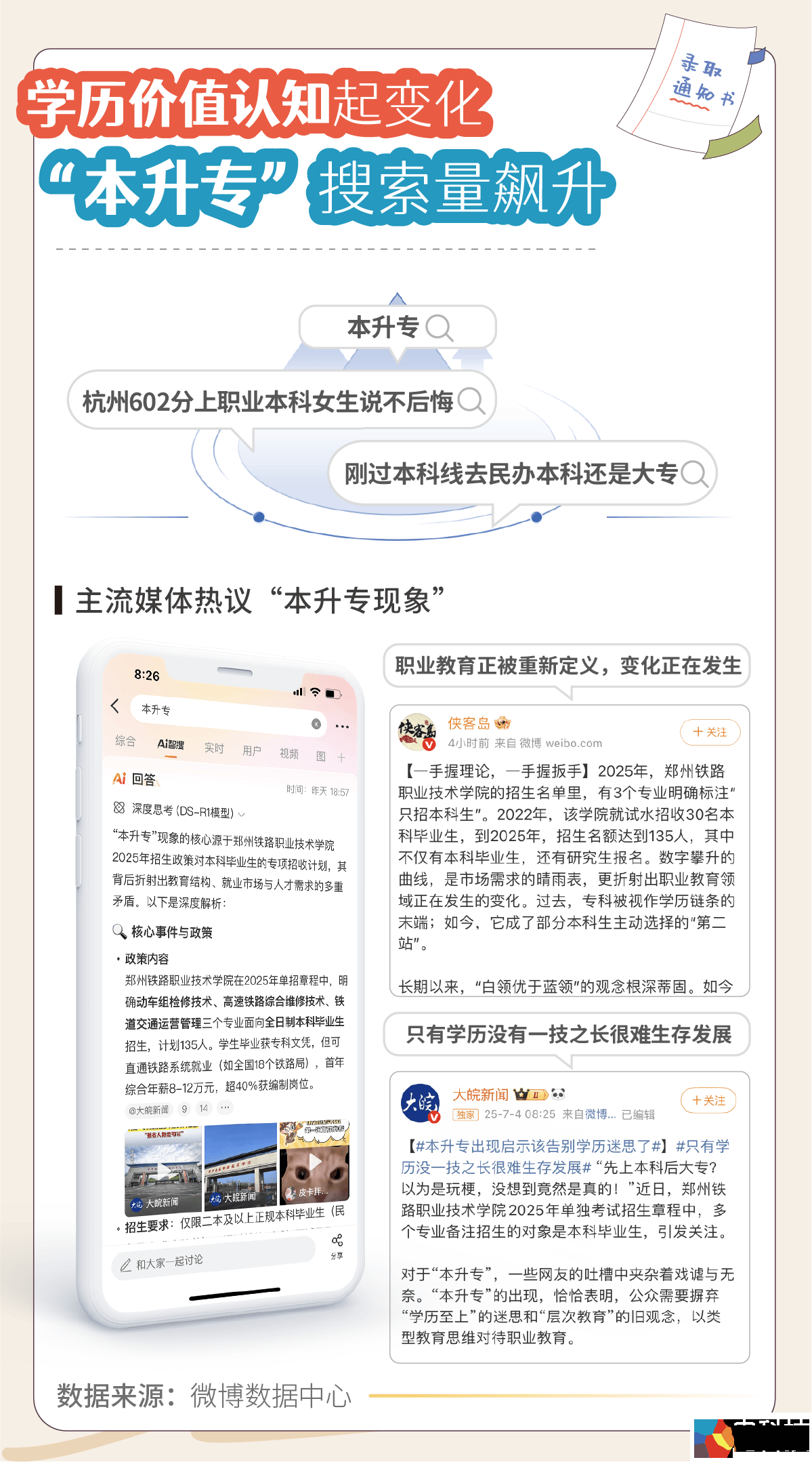 差异化赛道中,“本升专”搜索高频词的出现,也是意料之外、情理之中。“刚过本科线去民办本科还是大专”等问题搜索热度相继升高,表明新一代考生重新审视学历价值。@侠客岛 等主流媒体账号热议“本升专现象”,认为职业教育价值值得被市场重新重视。