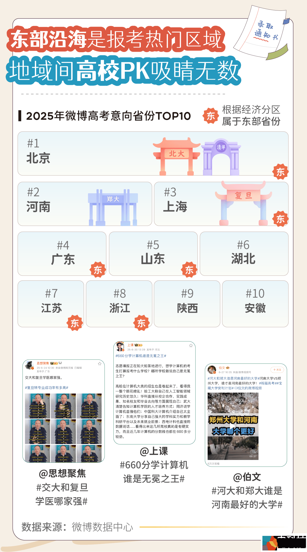 按照全国经济分区来看,拥有丰富教育资源与就业机会的东部地区,依然是考生心中热选。2025年微博高考意向省份TOP10显示,北京凭借教育资源优势稳居榜首,河南、上海分列二三位,广东、山东、湖北、江苏、浙江、陕西、安徽依次入榜。