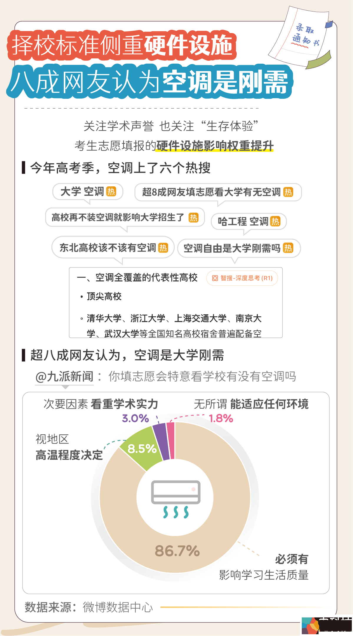 报告发现,关注就业前途与学术声誉的同时,今年考生也很关注“生存体验”,即志愿填报的硬件设施影响权重提升。今年高考季,空调上了六个热搜:#大学空调#、#超8成网友填志愿看大学有无空调#、#高校再不装空调就影响大学招生了#、#哈工程空调#、#东北高校该不该有空调#、#空调自由是大学刚需吗#等话题,表明考生对校园硬件设施关注度前所未有。紧随其后的智搜问答发现,不少网友会主动搜索高校空调等硬件配套情况,回答结果提到北京大学、清华大学、浙江大学、上海交通大学、南京大学、武汉大学等知名高校宿舍普遍配备空调。