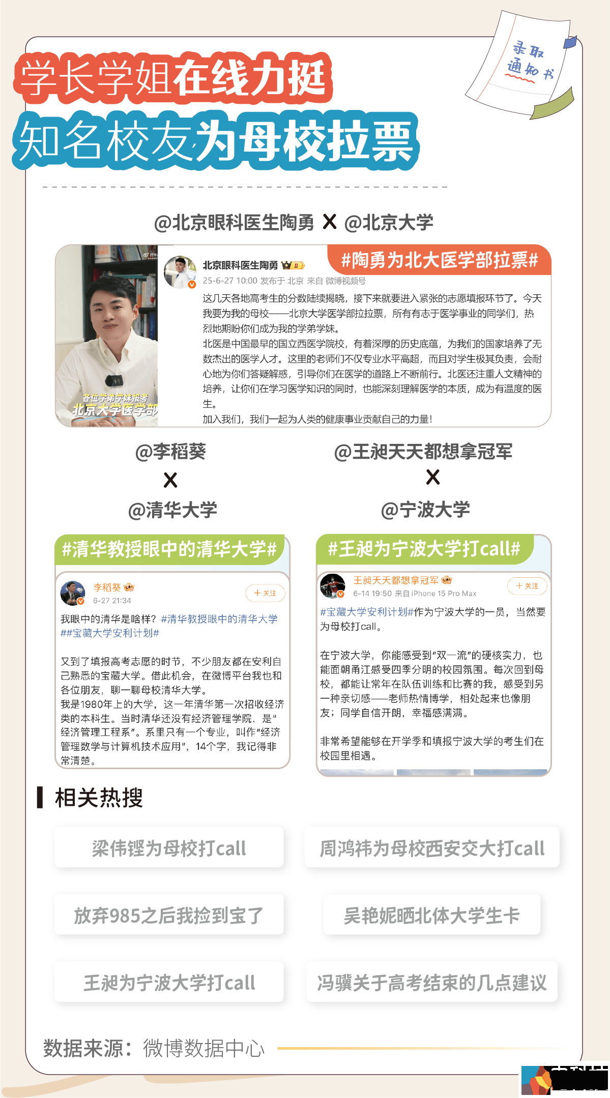 今年高考季,微博智搜持续发力,少不了各方优质内容贡献。知名校友纷纷为母校发声,形成强劲“拉票”风潮。@北京眼科医生陶勇 推荐北京大学,强调“北京大学医学部为我们国家培养了无数杰出的医学人才”;@李稻葵 回忆“清华教授眼中的清华大学”;羽毛球健将 @王昶天天都想拿冠军 为宁波大学打call,分享“在宁波大学,你能感受到\'双一流\'的师资实力”。此外,相关热搜话题还包括了“梁伟铿为母校打call”“周鸿祎为母校西安交大打call”“放弃985之后我捡到宝了”“吴艳妮晒北体大学生卡”等,母校情怀故事,为考生提供多元择校视角。