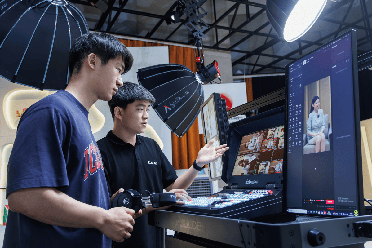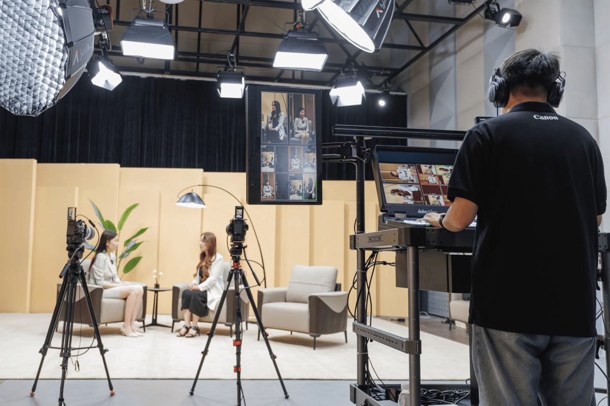 “新媒体超高清示范直播间”专业演播区域可根据嘉宾人数灵活选择多台佳能EOS R5 C直播