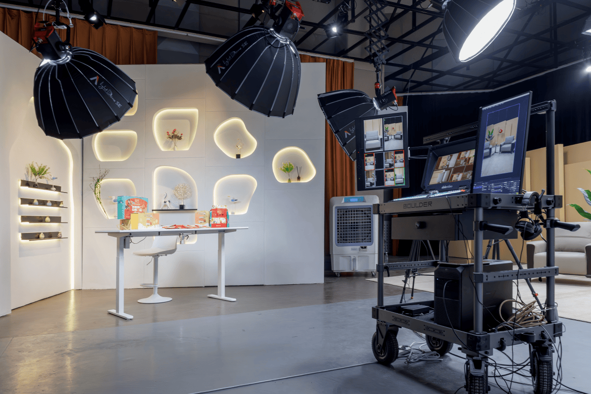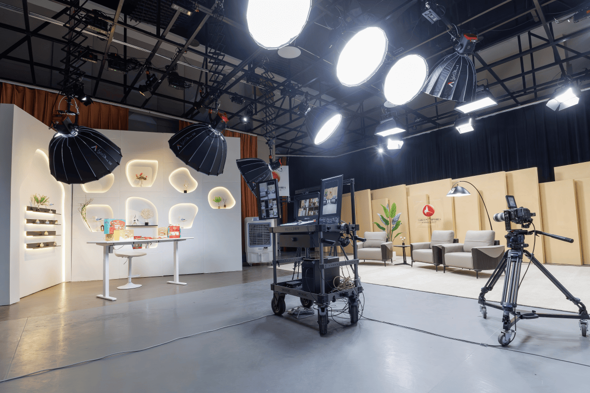 1)多功能场景设计:划分电商直播区与专业演播区,后者通过智能灯光系统、模块化背景和可调软装,实现多种专业场景快速切换;
