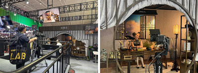 走进富士胶片(中国)展台(展位号:8B02),一个融合东方美学与异域风情的"古风书房"影棚场景引人瞩目,暗调氛围中层次分明的光影营造出浓郁的电影质感,让人仿佛置身影视创作现场。展台内,四组精心设计的机位以不同高度、角度排布,模拟影视创作中的多视角需求——这里不仅有Duvo系列三款PL卡口电影变焦镜头"HZK25-1000""HZK24-300""HZK14-100"的实景演示,更设置了由4K广播电视变焦镜头"FUJINON LA30x7.8BRM-XB2"(以下简称"LA30")组成的移动拍摄位,让参观者能够近距离操作体验,直观感受从广角到长焦、从固定机位到动态跟拍的丰富创作可能。