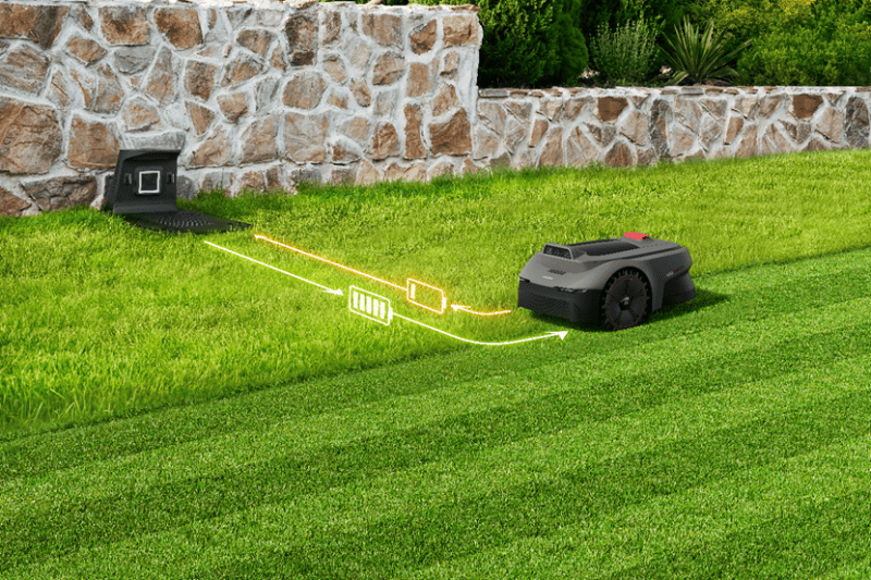 (当电量不足时,ViAX系列会自主返回充电,充满电后继续割草任务)