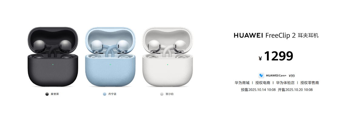 华为FreeClip 2 耳夹耳机2025年10月14日10:08开启预售,10月20日10:08正式开售,首发价格1299元,用户可登陆华为商城及各大授权电商平台或前往华为体验店、华为授权零售门店进行购买。