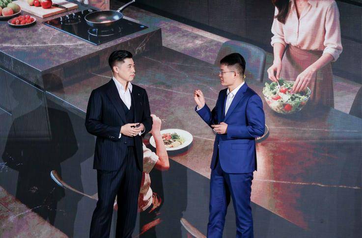 【海尔智家厨电产业中国区市场总经理李栋(右)与卡萨帝用户、世界数字科学院国际首席人工智能官杜兰】