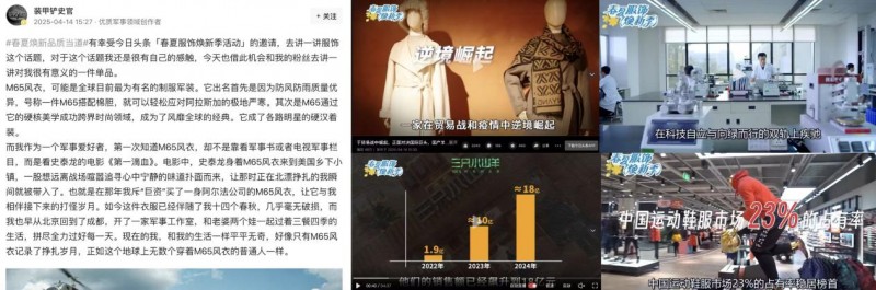 本次活动延续并升级春夏服饰焕新的达人运营逻辑,以专业属性+多元领域为核心,构建达人种草矩阵。此前春夏活动中,不同领域达人的内容已验证“跨界种草”的有效性:军事领域达人@装甲铲史官 以《第一滴血》电影为切入点,推荐M65风衣,通过硬汉美学+情感共鸣实现204万曝光;科技领域达人@硬核熊猫说 借“关税热点”解读中国服饰品牌,单期视频头抖双端曝光230万+,带动#春夏焕新品质当道#话题登头条TOP11;财经领域达人@域外编撰者 分析安踏品牌发展,实现头条31万曝光、抖音8.4万曝光,收获互动数达2095。