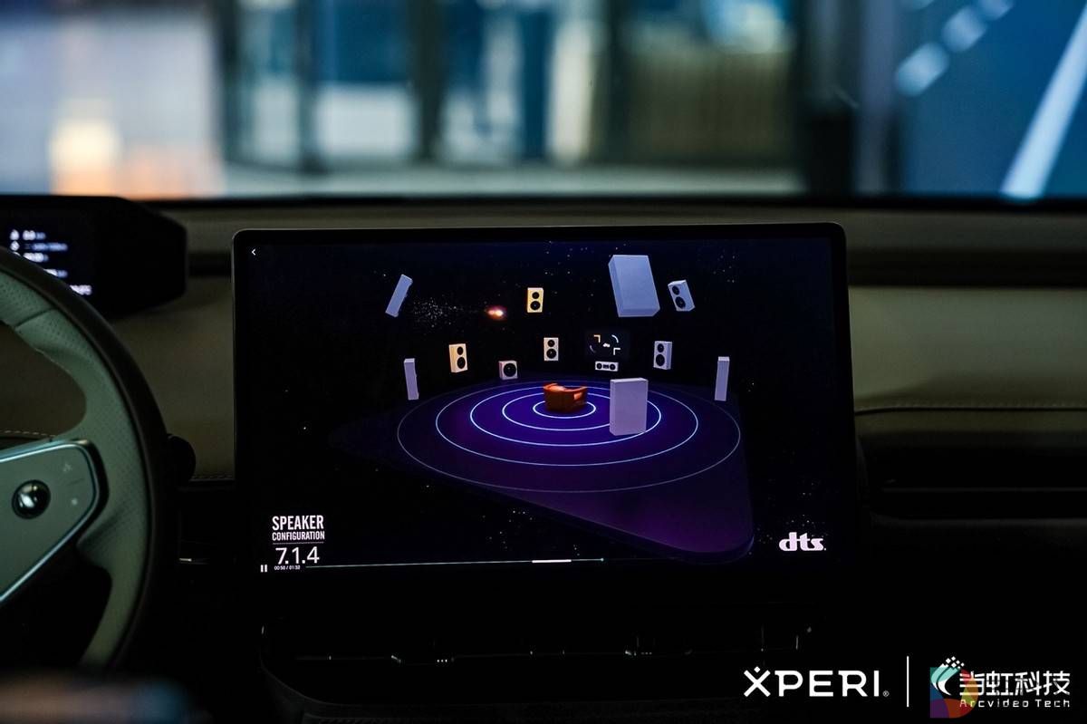 展车内的DTS音频解决方案集成由宇光智通(YGC)与德赛西威(Desay SV)携手打造,双方通过硬件配置的全面升级及核心软硬件技术的深度整合,推动了行业领先全场景声学解决方案的落地。其中YGC将DTS:X编解码和上混方案同时呈现;Desay SV则提供了行业领先的9.1.4音响系统;并在声道配置上采用前排与后排主动三音频设计,通过精准的频段分离与声音定位,实现高中低音频的均衡呈现;在保证声学系统的稳定输出及卓越性能的同时,采用双外置功放方案,形成“主副协同”的硬件支撑系统,确保音频信号的高保真还原。