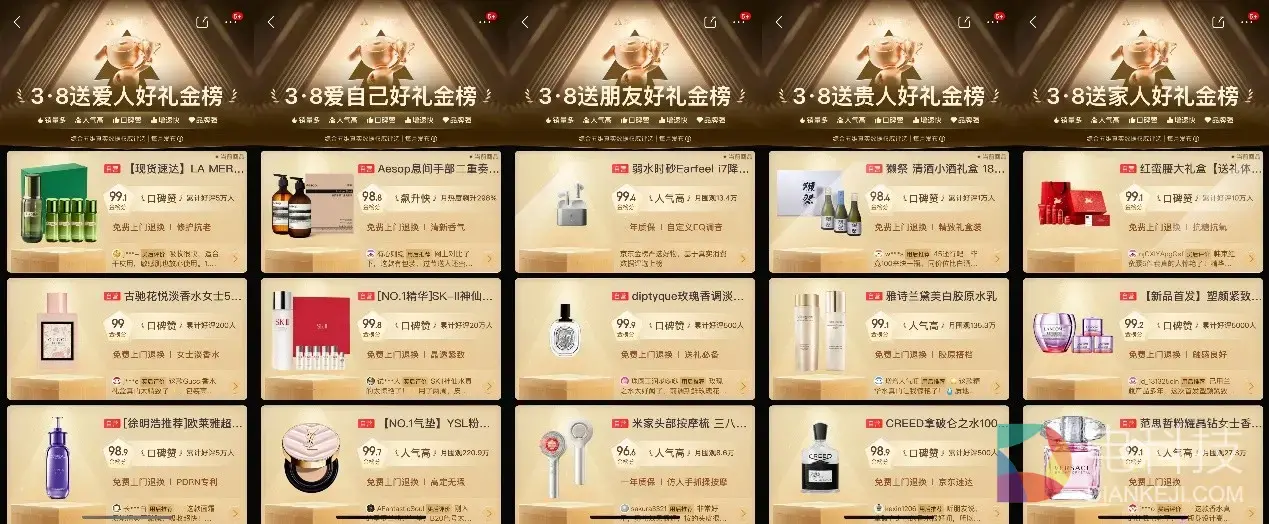 除了派送节日好礼,为了满足3.8节期间消费者多元化的送礼需求,京东还基于平台亿万消费者的真实购买数据,围绕“送自己、送爱人、送家人、送朋友、送贵人”五大核心场景,推出“3.8犒劳老己好礼金榜”、“3·8送朋友好礼金榜”、“3·8送爱人好礼金榜”、“3·8送家人好礼金榜”、“3·8送贵人好礼金榜”五大榜单,从海量商品中精选出适配各个送礼场景的好物,帮助消费者精准锁定礼物选择,让3.8节的每一份心意都能恰到好处。