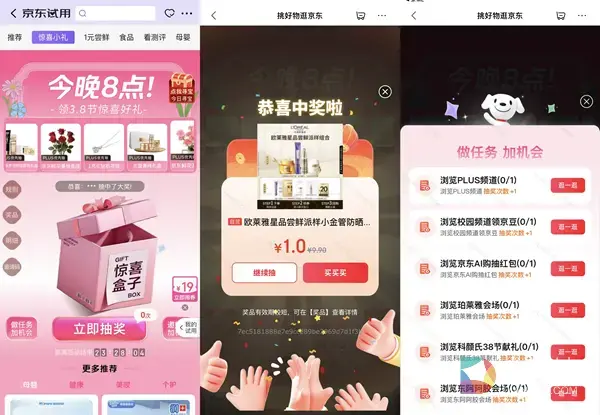其中,3月4日,京东试用将送出新疆有机大红枣、手剥阿富汗瓜子鲍鱼果仁等试吃礼;3月5日,将送出正官庄红参液、长白山人参、、胶原蛋白肽、Swisse等春季滋补品试用礼;3月6日,将送出普拉达粉底液、毛戈平粉底+唇釉套组、赫莲娜白绷带等百大品牌试用装;3月7日,提供希思黎全能乳液、雅萌精华面膜、口腔小美盒、十月结晶卫生巾安睡裤组套等试用;3月8日,全品类试用礼惊喜掉落。