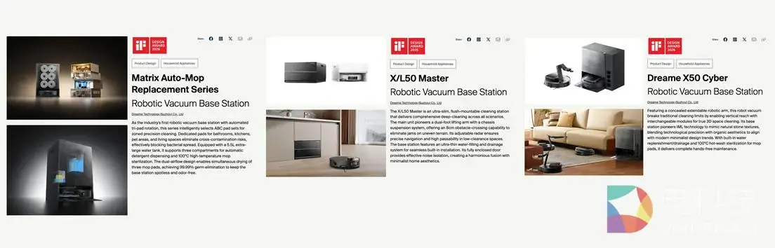 近日,被誉为“设计界奥斯卡”的德国iF设计奖正式公布2026年度获奖榜单,追觅扫地机Matrix 系列、Dreame X50 Cyber、X/L50 Master三款产品,从全球千余件参赛作品中脱颖而出,成功斩获该项国际权威大奖,彰显了追觅扫地机全球高端市场的竞争力。