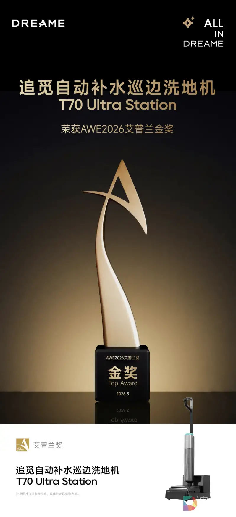 在本届AWE 2026展会期间,追觅T70 Ultra Station获得了家电界最高荣誉--艾普兰奖金奖,也是本届展会唯一一个获得艾普兰金奖的洗地机品牌,以创新实力再次展现了品牌在洗地机领域的领先实力。