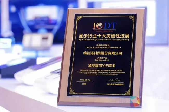 4月1日,ICDT 2026开幕式揭晓“中国显示行业十大突破性进展”,维信诺全球首发ViP技术成功入选。该评选由国际信息显示学会SID北京分会发起,面向2016年至2026年间中国显示行业在技术研发、产业化及应用拓展领域形成显著影响的代表性成果,并经50余位SID北京分会技术委员会专家评审。
