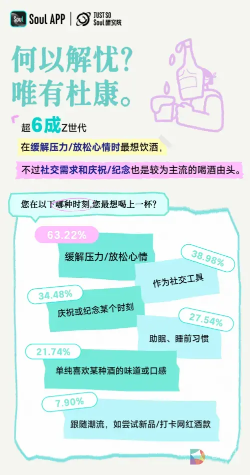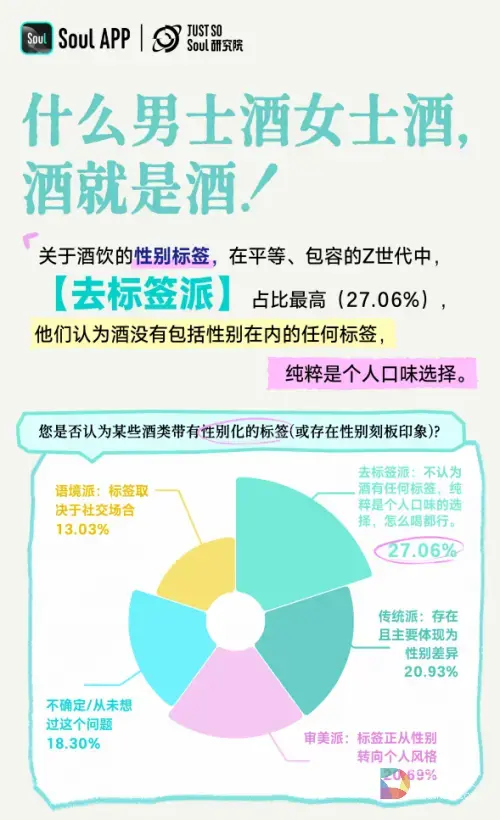 这种“去标签化”的产品哲学,在 Just So Soul 研究院出品的《Z世代饮酒生活方式报告》中得到互证:调查显示,Z世代正在撕掉酒杯上的标签,“酒就是酒”成为新共识。27.06%的年轻人认为酒*真实的部分——口味——凌驾于包括性别、审美风格在内的任何标签之上。
