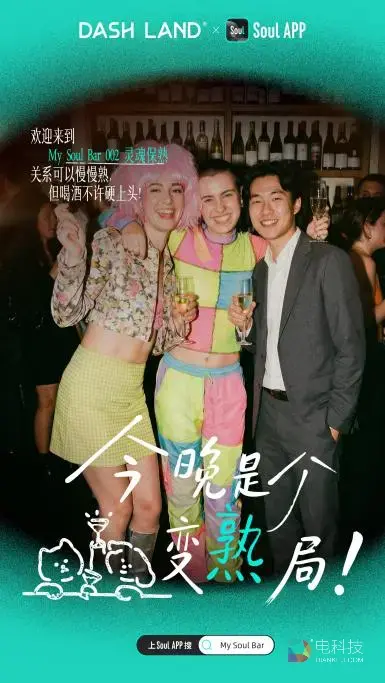 近日,Soul 联合知名酒吧品牌 DASH LAND 正式开启 “My Soul Bar” 联名酒馆,计划在今年内全国陆续点亮至少 30 个线下社交坐标,作为宏大迁徙的先行篇章