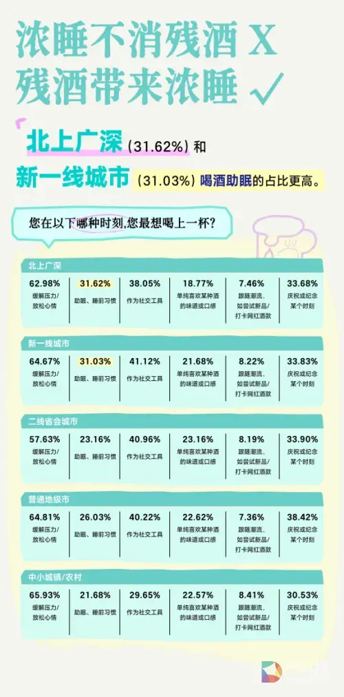 更有趣的是,12.6% 的一线城市青年甚至将酒精开发为一种“生产力工具”,在加班或学习的紧绷间隙以此“提劲”。这种极具韧性的实践,恰恰揭示了 Z 世代在秩序中寻求灵感火花、在日常中抓取氛围感的积极逻辑。当酒杯接纳了生活的厚重,微醺便成了他们成本*低、也*能即时找回状态的“情绪解药”。