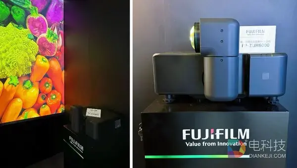 本次展台还设置了富士胶片"Z系列"投影机另一主力机型FP-ZUH6000的实机展示区。该机型支持4K分辨率与6000ANSI流明高亮度,并且延续了"Z系列"标志性的"折曲式双轴旋转镜头"结构,无需移动机身或调整镜头方向,即可实现多方向图像投影,还能在短距离实现大尺寸画面的投影,体现出该系列一贯的安装灵活性与空间适应性。