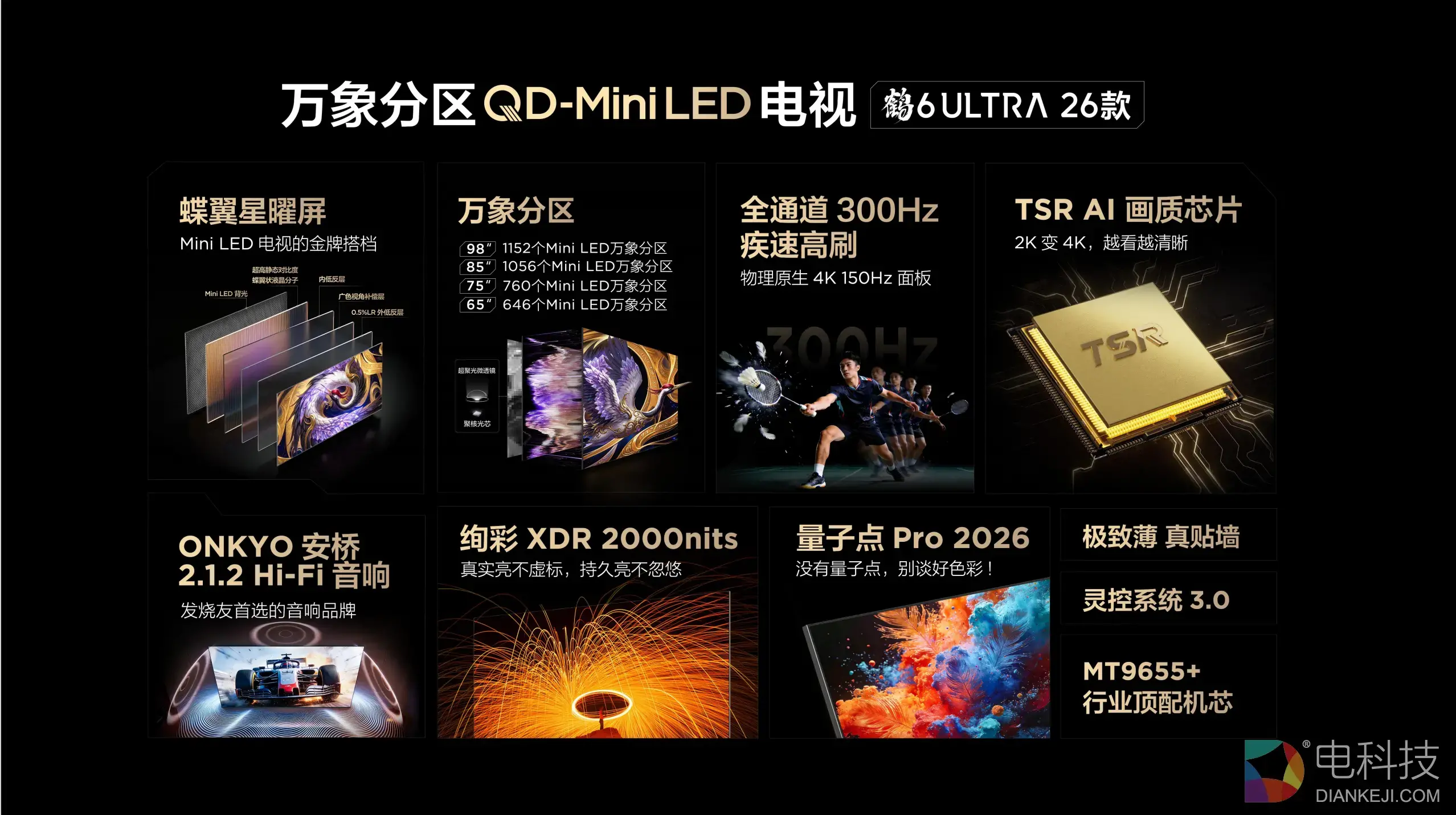 鹤6 Ultra 26款全系搭载万象分区技术,98英寸版本分区数达1152个,85英寸1056个,75英寸760个,65英寸646个。与传统分区方案不同,万象分区通过聚核光芯(亮度提升53.8%)、超聚光微透镜、微距OD和自研控光算法四个环节的协同优化,实现了“一区顶多区”的控光效果。在Mini LED成像全链路上,从发光芯片到最终屏幕呈现,每个环节都做了针对性技术升级。
