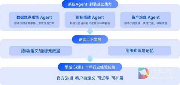 第二层:100+预置行业 Skill。覆盖用户分析、留存分析、付费分析、投放分析、运营分析等 8大领域。这不是通用的数据查询能力,而是特定行业的分析方法论——比如"留存"该怎么拆、"付费"该看哪些维度、"投放 ROI"该怎么归因。每个 Agent都自带专家技能。