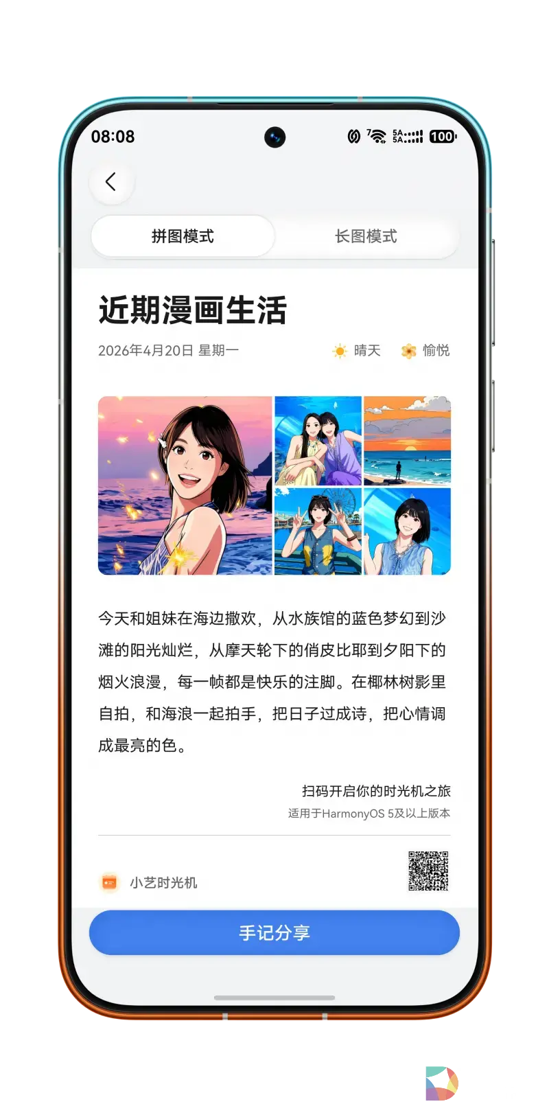 记录与表达,正成为年轻一代的生活方式。小艺用AI技术持续帮助更多年轻用户进行影像创作,用有趣好玩的AI功能降低创作门槛。比如“小艺时光机”在日常生活、亲子成长、节日欢聚等核心场景中的升级,能为用户的美好记忆增添童话色彩。授权后,小艺时光机智能感知梳理用户的生活照片、地点、天气等信息,后台无感生成漫画风格的趣味日记;无论是亲子成长的温馨场面,还是节日欢聚的美好瞬间,小艺时光机都能生成独具风格主题的手记,并配以灵动文案,帮助用户记录下精彩瞬间与美好时光,让分享充满故事性与个性魅力。